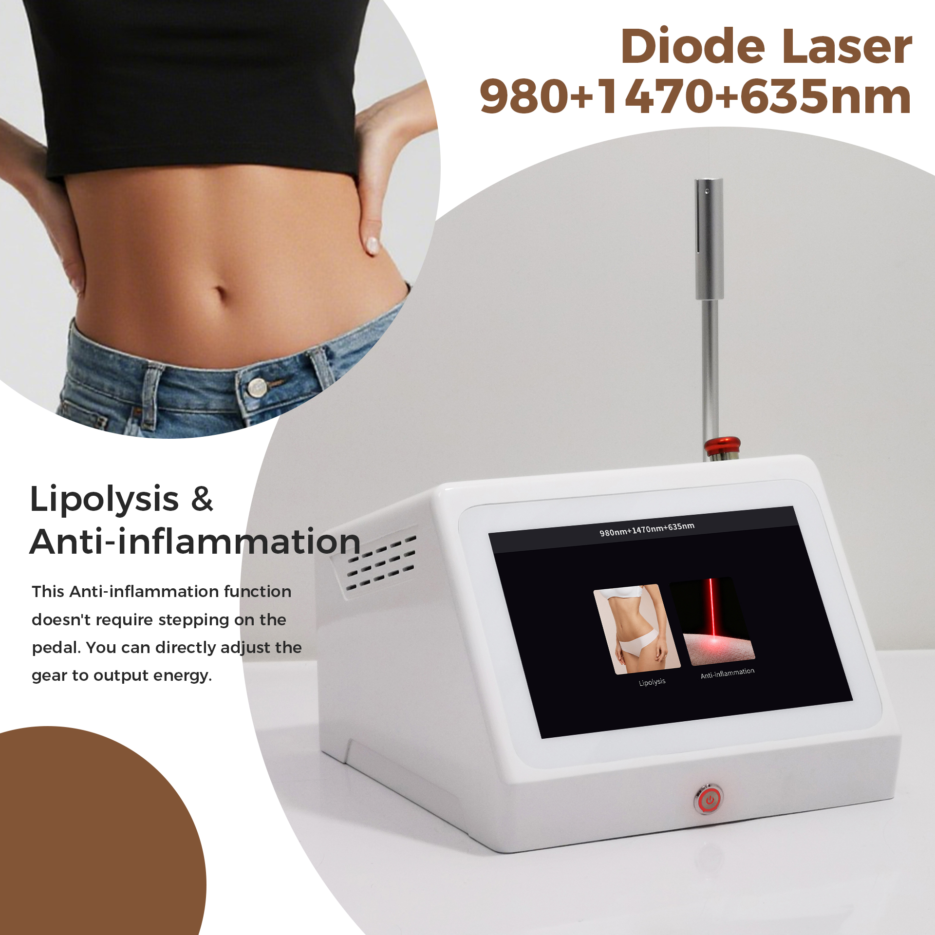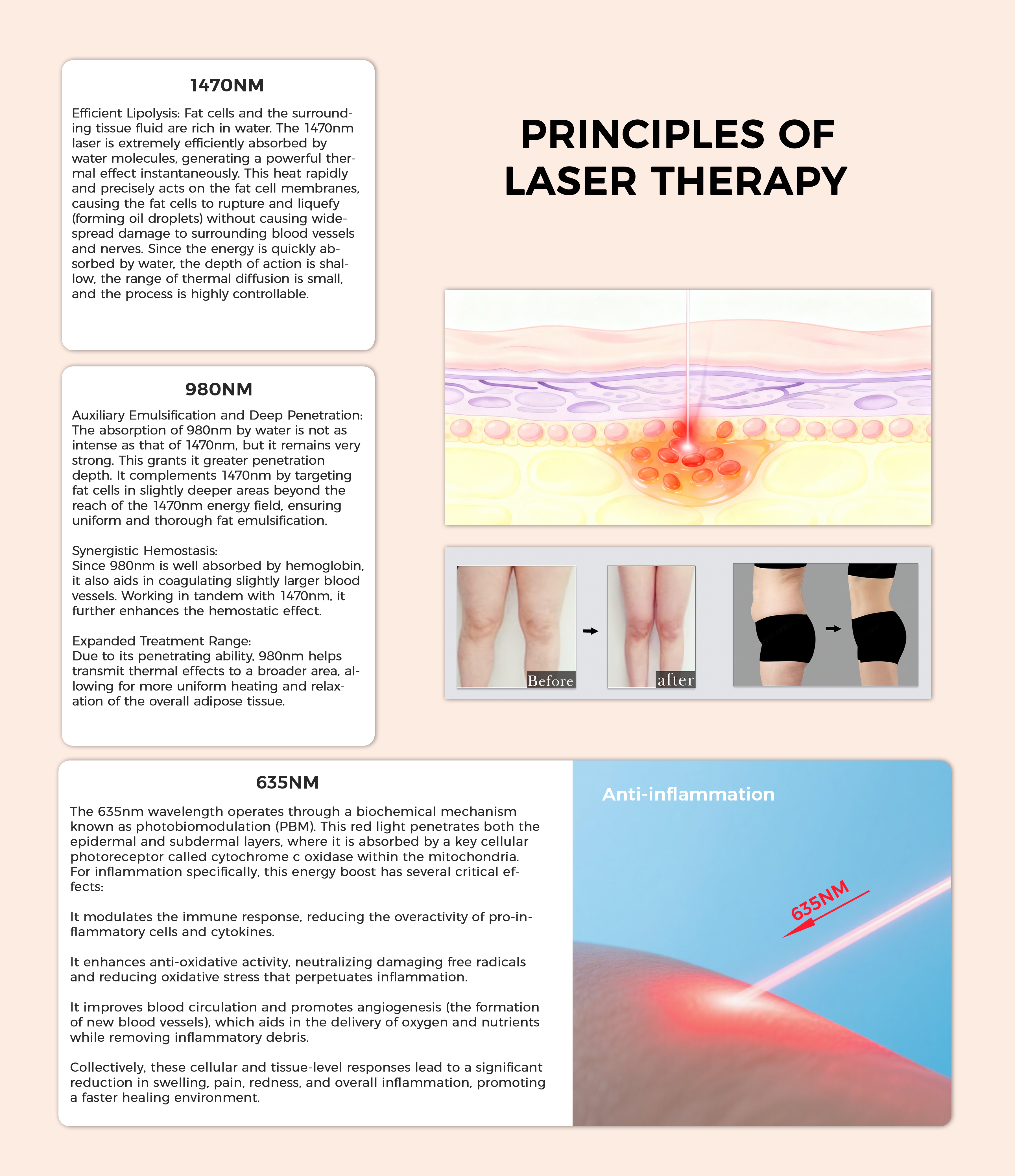 The Synergistic Advantage: Using these wavelengths in combination or sequence allows for sophisticated treatment protocols. For example, performing lipolysis (1470/980nm) followed by anti-inflammatory therapy (635nm) in the same session can potentially improve patient comfort and streamline the recovery process.