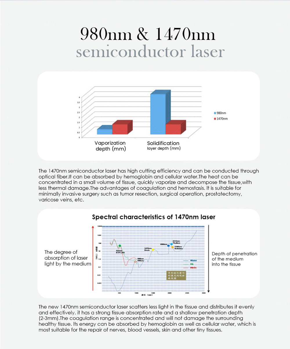 - 980nm Wavelength: Optimally absorbed by both water and hemoglobin, making it ideal for vascular treatments and deep tissue heating. This wavelength is particularly effective for porphyrin vascular cell absorption, enabling instant coagulation and dissipation of vascular lesions.