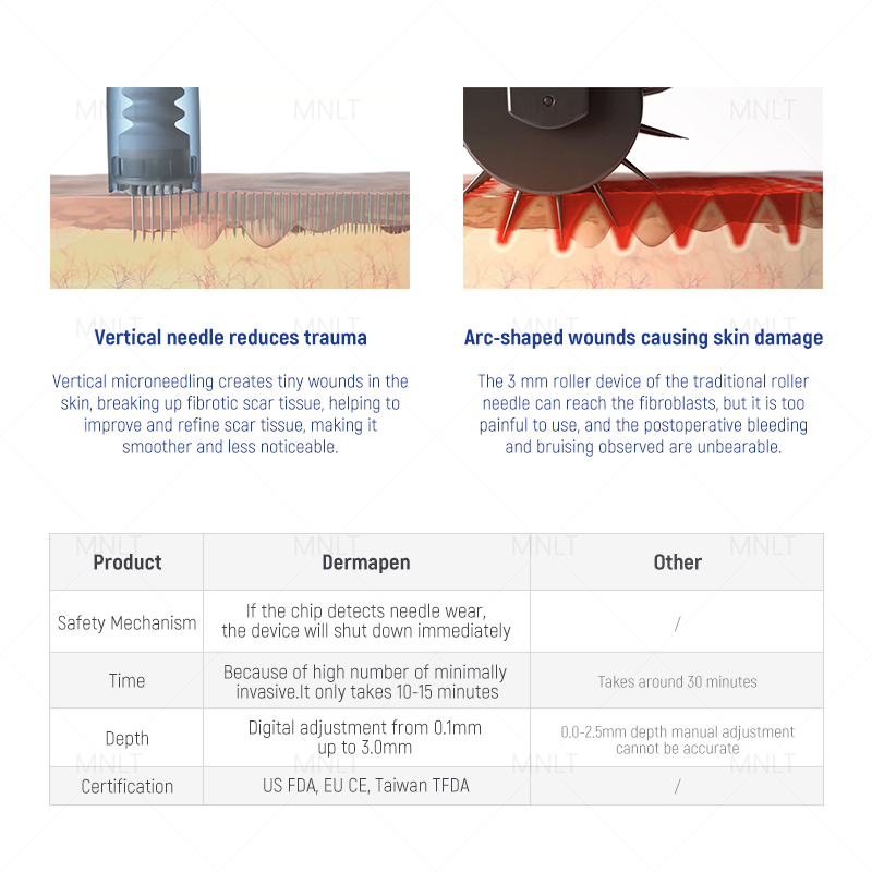 Vertical microneedling creates tiny, even wounds in the skin, breaking up fibrotic scar tissue and helping to refine scar texture—making scars smoother and less noticeable. The 90° entry/exit points eliminate skin tearing, reduce pain, and minimize postoperative bleeding and bruising.