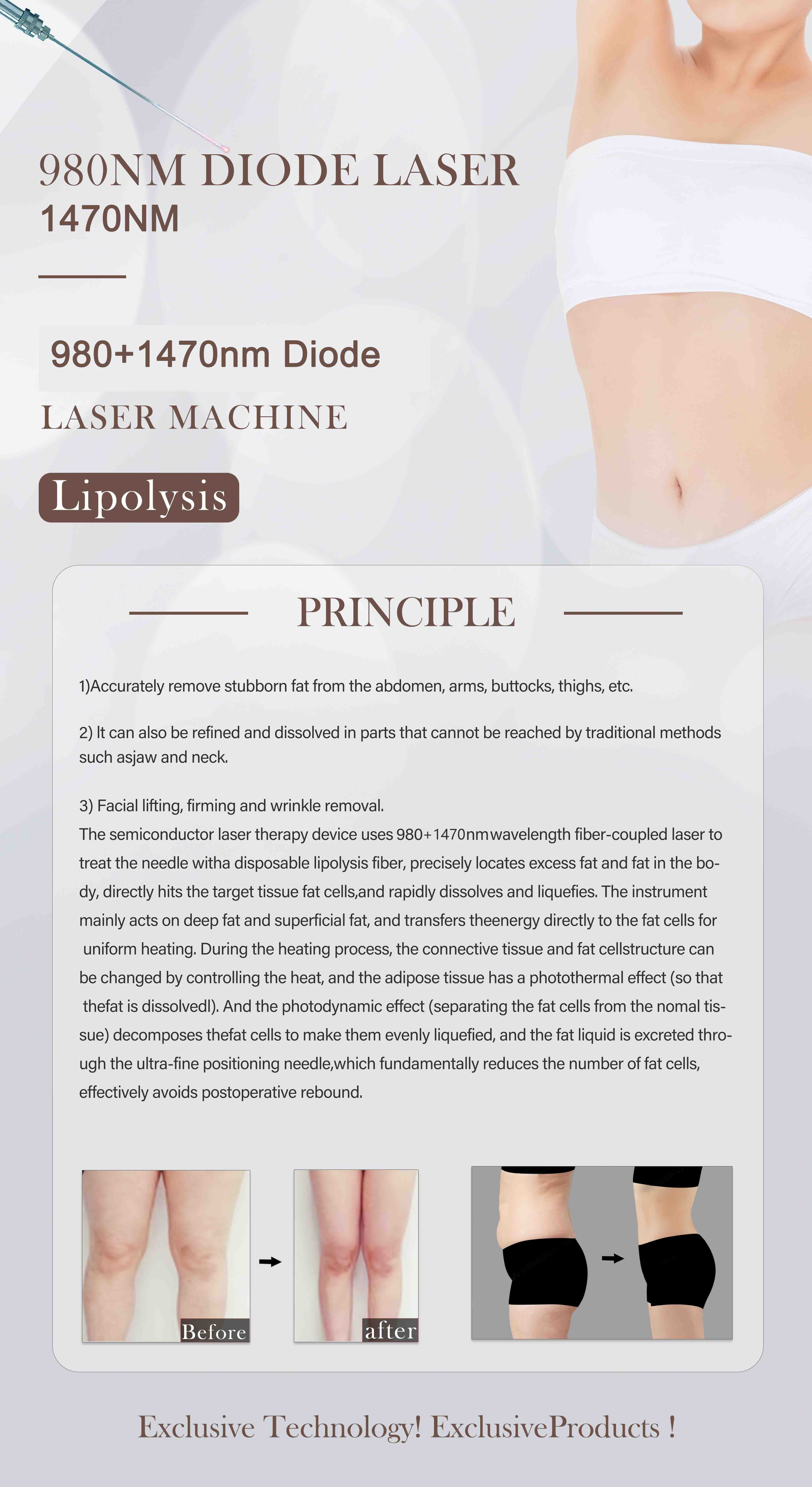 - The 1470nm Wavelength: Your partner for deep tissue work, expertly absorbed by the water within fat cells for clean, efficient lipolysis and powerful skin tightening. This is the wavelength that convinces patients during their consultation, as they see the promise of addressing areas diet and exercise cannot reach.