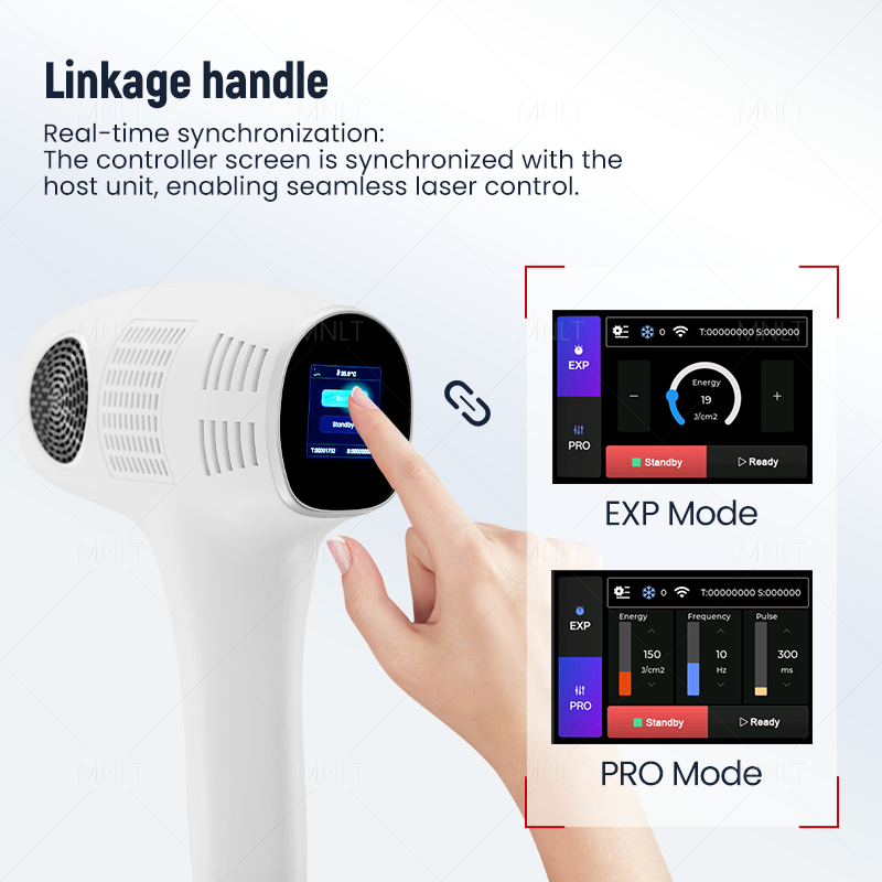 The Portable Soprano Ice Diode Laser Machine features a linkage handle with real-time synchronization—your controller screen syncs seamlessly with the host unit, enabling smooth, precise laser control. Its 4.3-inch smart touchscreen lets you swipe to adjust parameters effortlessly, with intuitive interface options including Startup screen, EXP Mode, PRO Mode, Rental Mode, and Restricted areas.